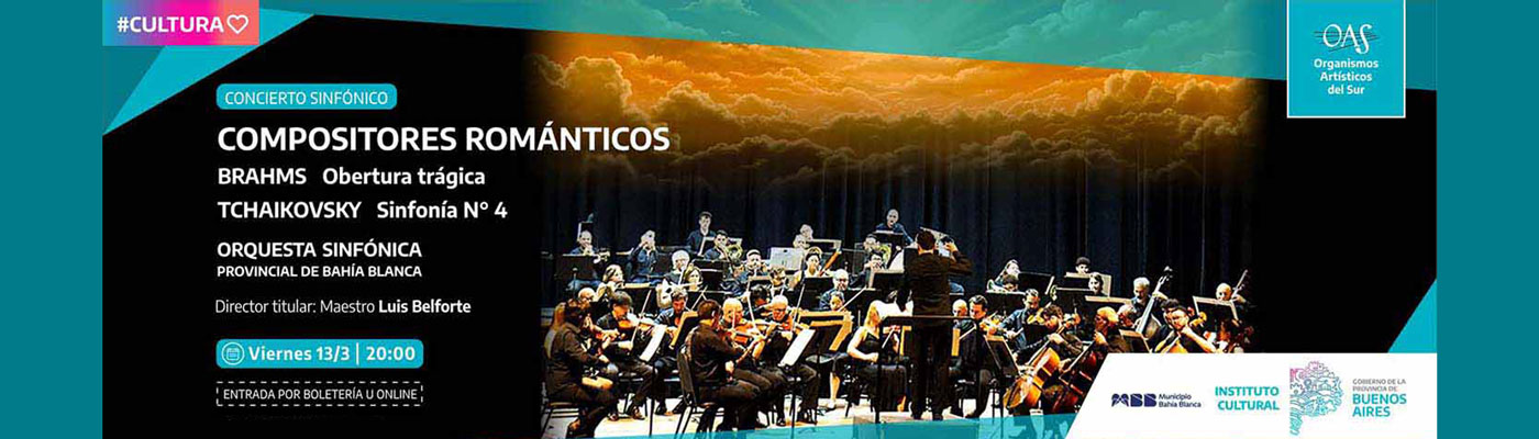 Organismos Artísticos del Sur, brindará un concierto sinfónico titulado “Compositores románticos”. Se interpretarán la Obertura trágica, Op.81 de Johannes Brahms y la Sinfonía N°4 en fa menor, Op.36 de Piotr Ilich Tchaikovsky.